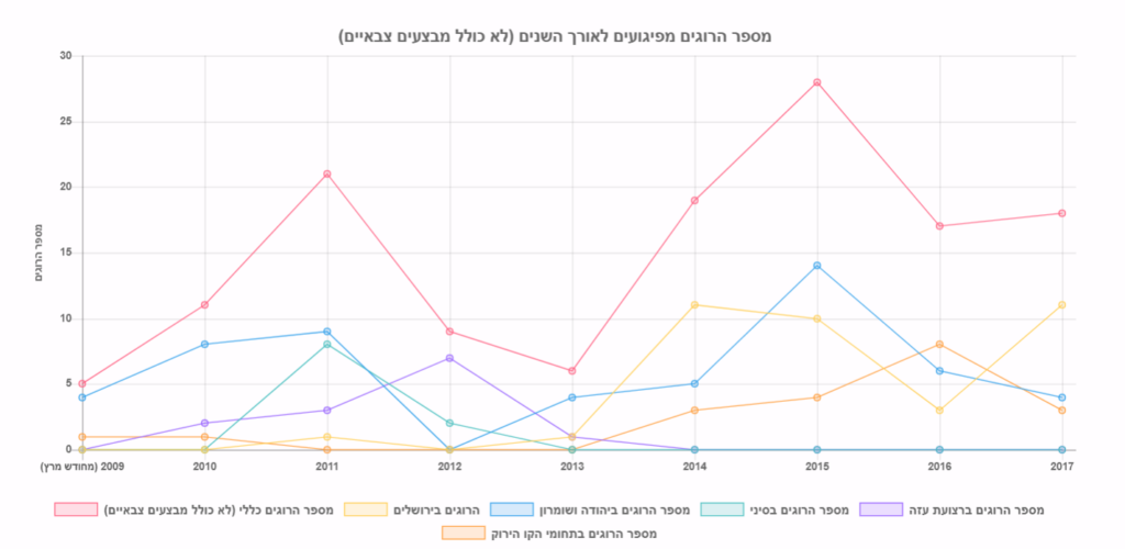 מספר שיא של הרוגים היה בשנת 2015. בספטמבר אותה שנה החלה "אינתיפדת הסכינים" במהלכה מתו 47 בני אדם מפעולות טרור.