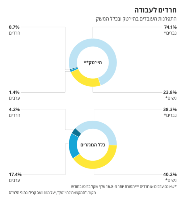 לאחרונה פורסמה בעיתון דה מרקר ידיעה העוסקת בשילובן של נשים חרדיות שבשוק העבודה, ובפרט בהיי-טק. בתוך הידיעה היה ניתן למצוא את הגרפים הבאים: